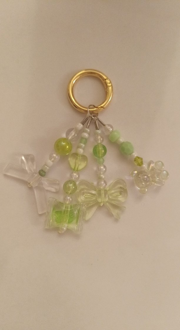 Pastel yeşil boncuklardan oluşan, şeker, ayıcık ve fiyonk figürlü minimalist anahtarlık. El emeğidir, kullanılmamıştır.
