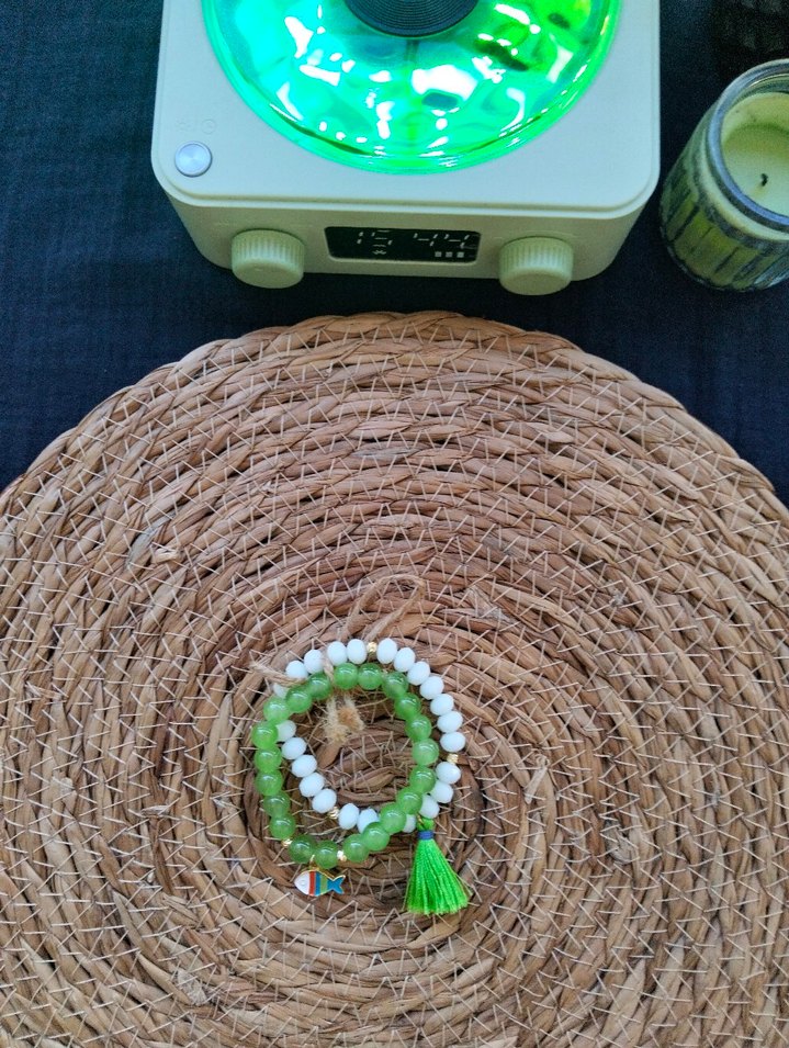 Yeşil ve beyaz boncuklardan oluşan iki bohem tarzda kadın bileklik seti. Birinde yeşil nakışlı püskül, diğerinde renkli minik bir aksesuar bulunur. Kendi el yapımımdır. İnce bileklere uygundur.