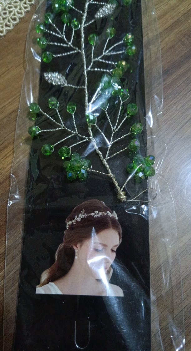 Koyu yeşil cam boncuklarla süslü, bohem ve avangart tarzda kadın saç aksesuarı. Dal desenleri ve ışıltılı boncuklar içerir.