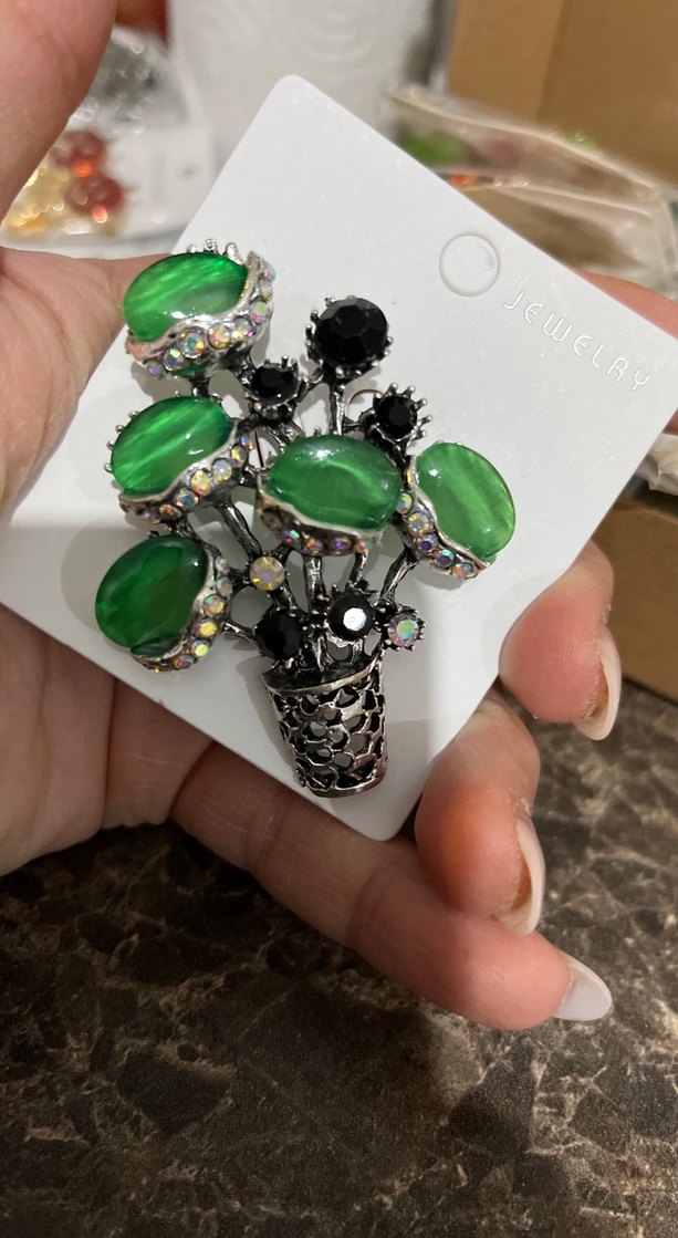 Koyu yeşil boncuklu, siyah detaylı çiçek deseni broş. Bohem avant-garde tarzında, düğün için uygun.