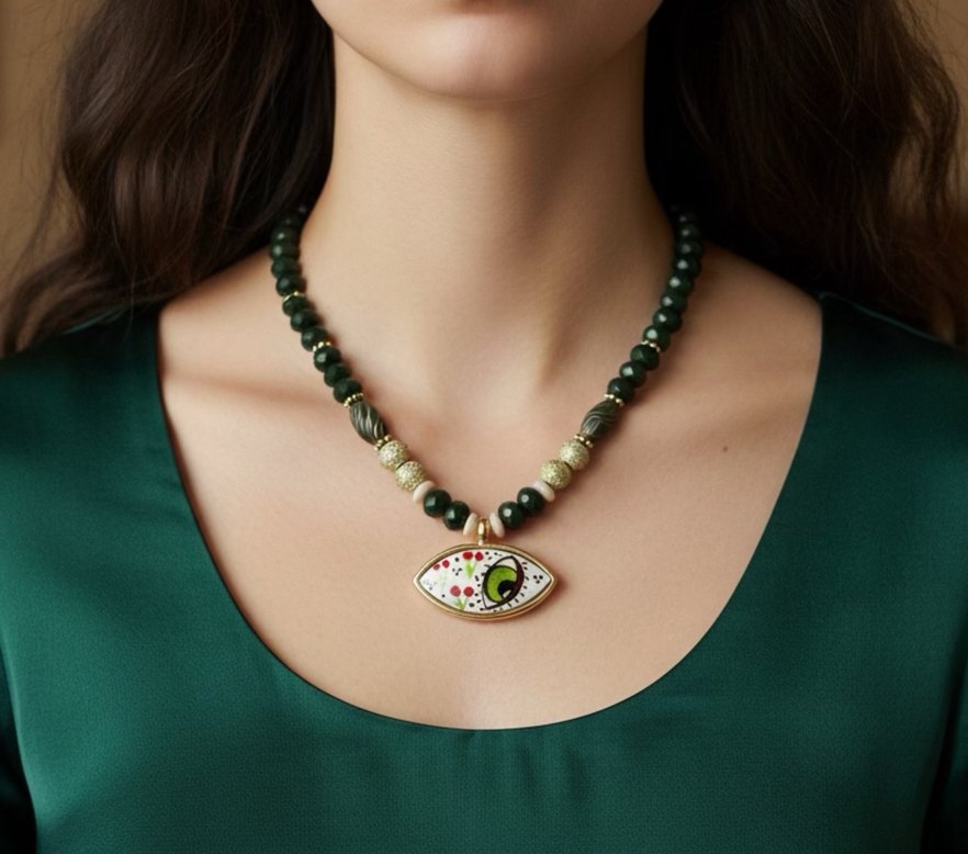 Koyu yeşil boncuklar ve etnik desenli göz figürlü kolye, bohem tarzı yansıtır. Romantik akşamlar için uygundur.