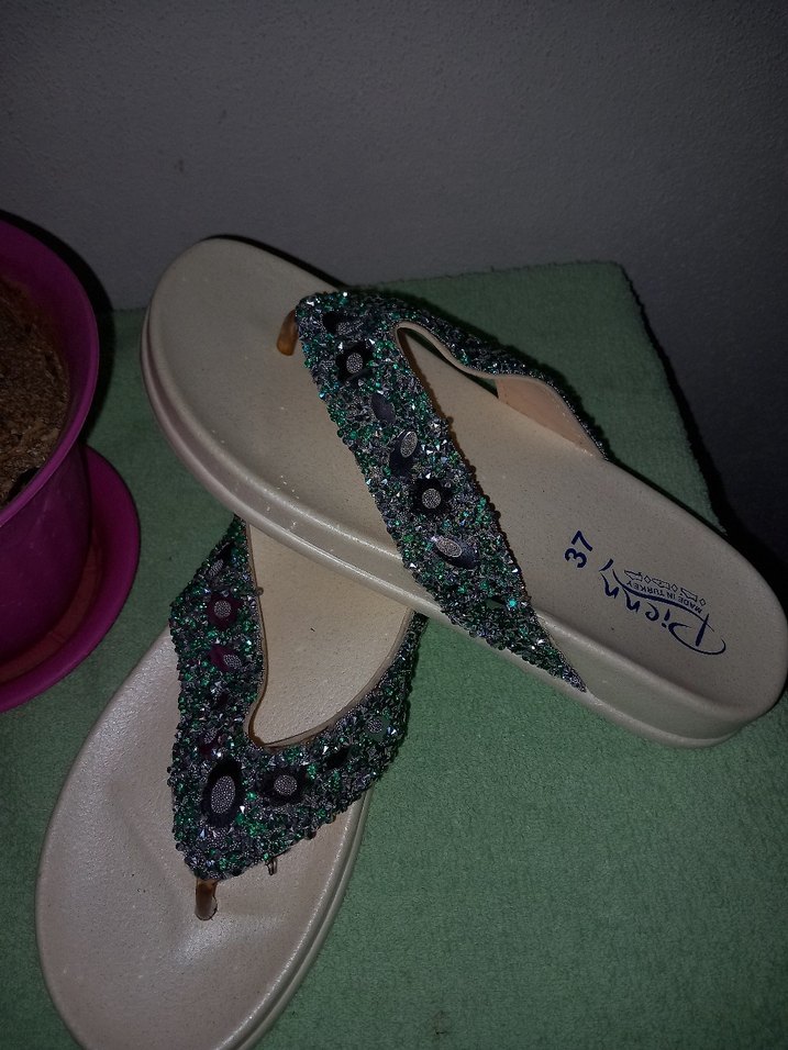 Düğün ve gösterişli günlük kullanım için yeşil, boncuklu nakışlı tasarıma sahip dolgu topuklu kauçuk terlikler.