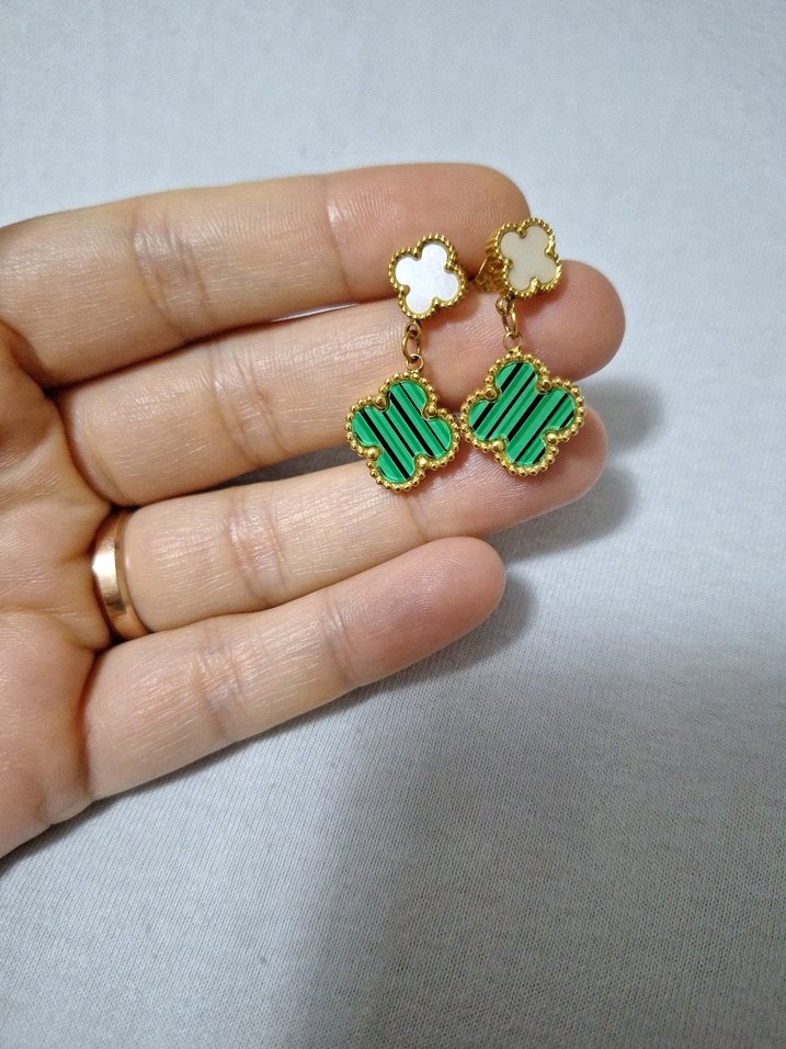 Yeşil boncuklu yonca şekilli midi küpeler, altın detaylar ve beyaz aksanlarla minimalist ve bohem tarzı birleştirir.