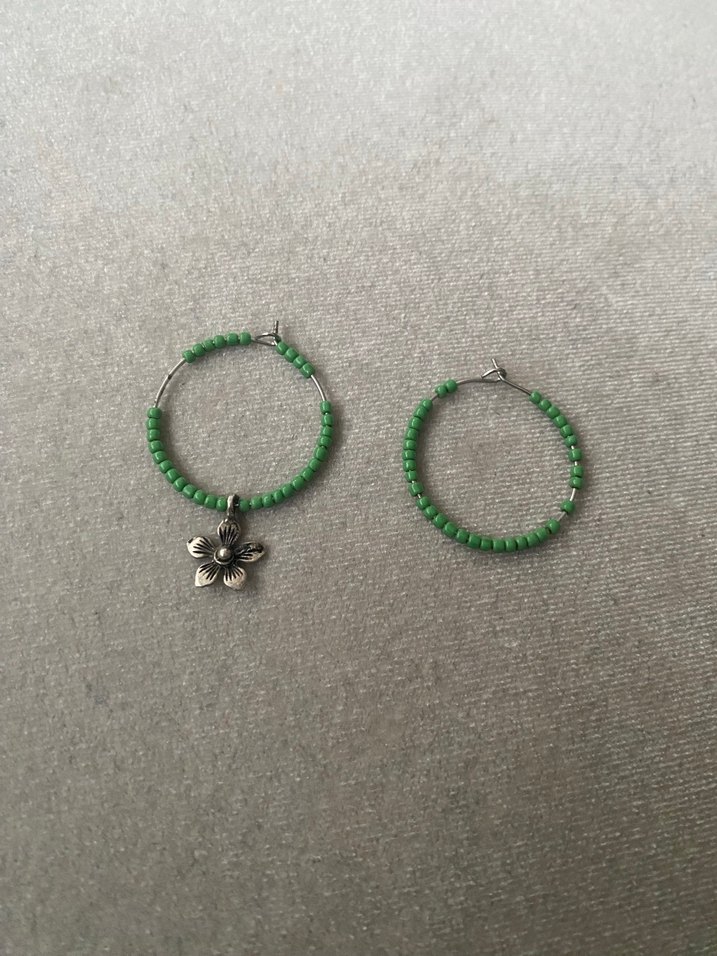 Kısa uzunlukta, yeşil boncuklarla süslenmiş halka küpelerden biri küçük çiçek figürü taşır, minimal ve bohem tarz için uygun.