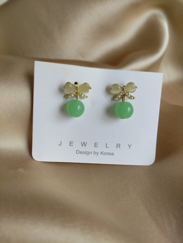 Pastel yeşil boncuklu ve zarif fiyonk detaylı modern klasik küpe, romantik akşamlar için ideal. Kore tasarımı.