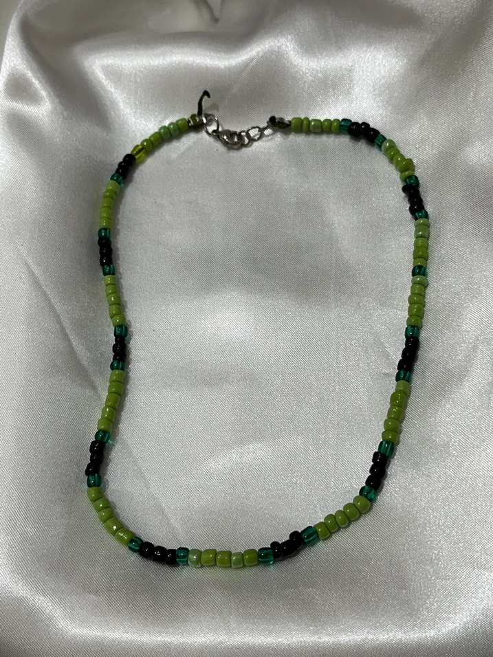Koyu yeşil ve siyah boncuklardan oluşan, tie-dye desenli boncuklu . Minimalist ve bohem tarzlara uygun, günlük kullanıma ideal.