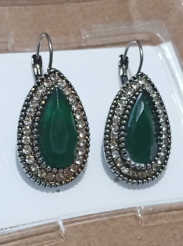 Parlak yeşil damla boncuklarla süslenmiş, desenli detaylara sahip uzun bohem tarzı küpeler, günlük kullanım için uygun.