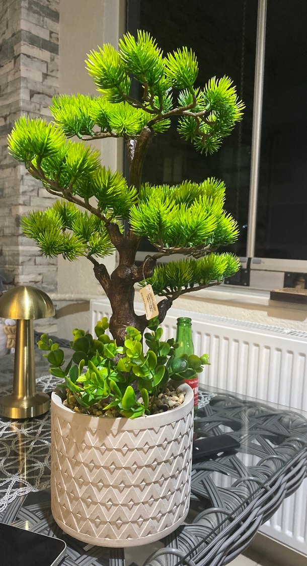 Beyaz desenli saksıda yeşil bonsai ağacı ve sukulent bitkiler. Her odaya doğal bir şıklık katar.