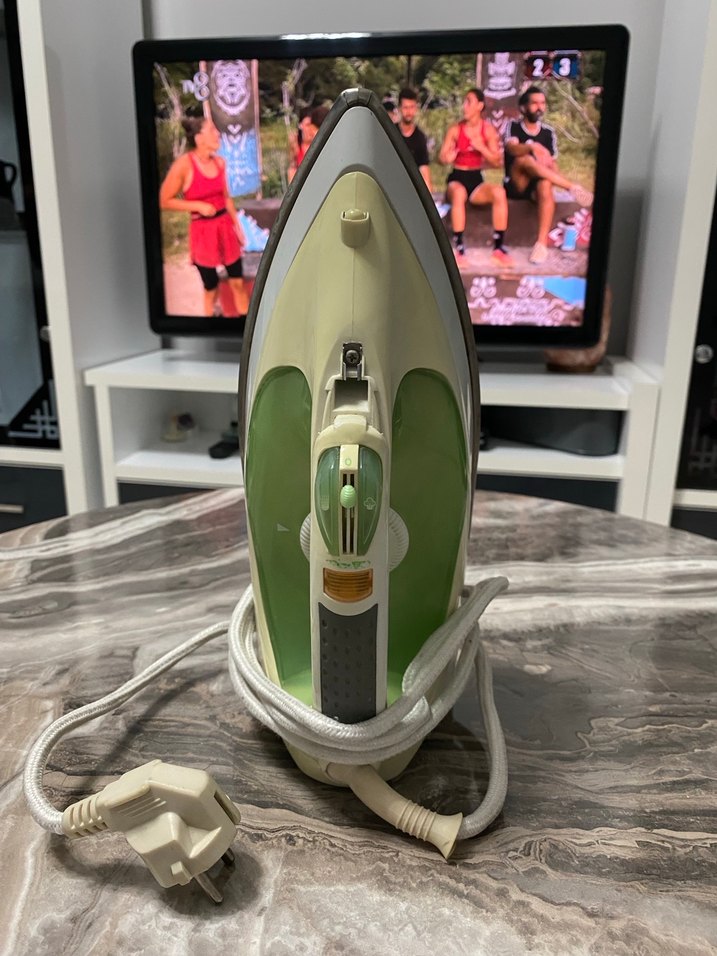 Yeşil renkli buharlı ütü, rahat tutuş ve uzun kablo ile kolay kullanım sağlar.