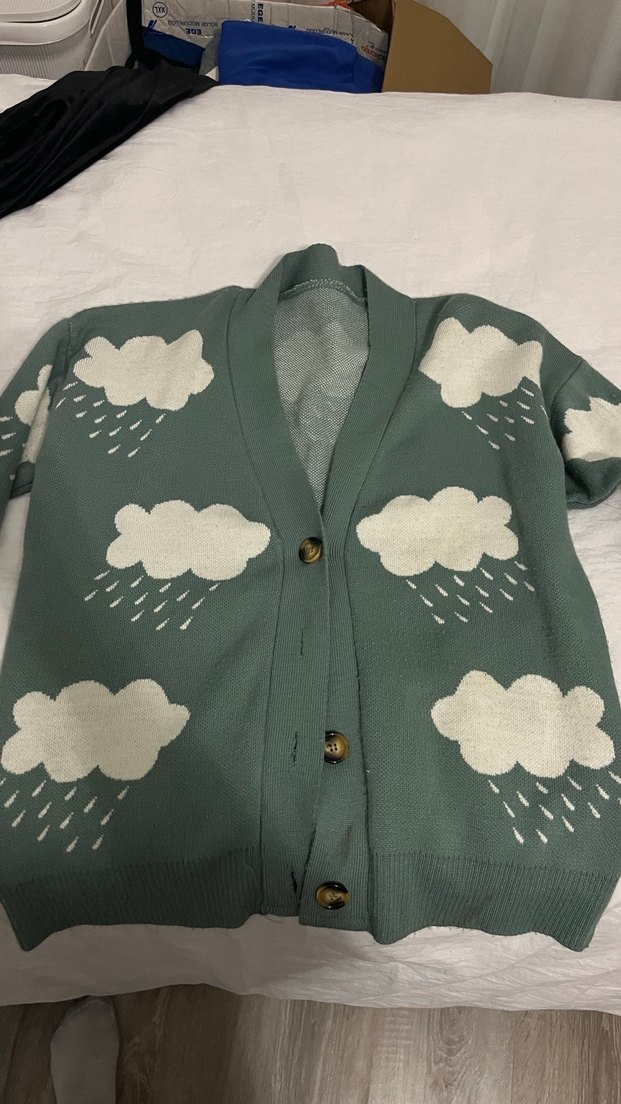 Örgü kumaştan, yeşil midi boy, bol kesim hırka. Notlu yaka ve beyaz bulutlu yağmur desenleriyle rahat ve şık. Uzun kolludur. ️
