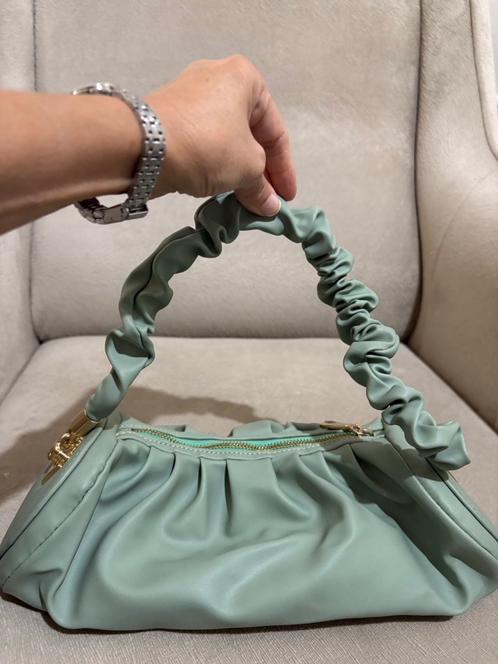 Yeşil renkte, büzgülü saplı, fermuarlı üst kısmı olan, yumuşak sentetik deriden yapılmış kadın çantasıdır.