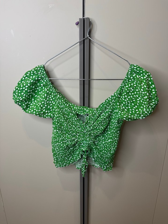 Kısa ve şişkin kollu straplez, yeşil mini bluz, renkli desenli ve bohem tarzda. Kollari düşükte kullanılabilir. Xs/s uyumludur.