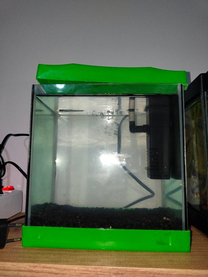 Koyu yeşil çerçeveli, filtre sistemli küçük cam akvaryum. Su canlıları için uygundur.