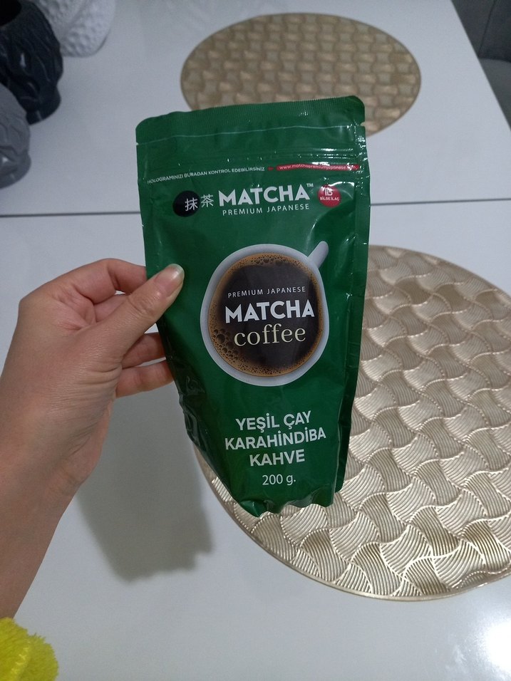 200g'lık paket, yeşil çay ve karahindiba içeren premium Japon Matcha kahvesi sunar. Koyu yeşil, kilitli poşette.