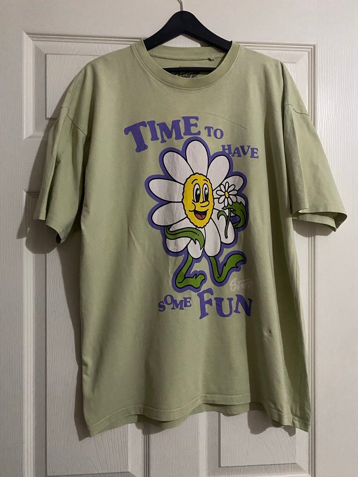 ,bol kesim, kısa kollu yeşil kadın tişörtü, crew neck ve neşeli çiçek baskısı ile. Üzerinde "TIME TO HAVE SOME FUN" yazısı var. Pull and bear. L beden. Defosuz