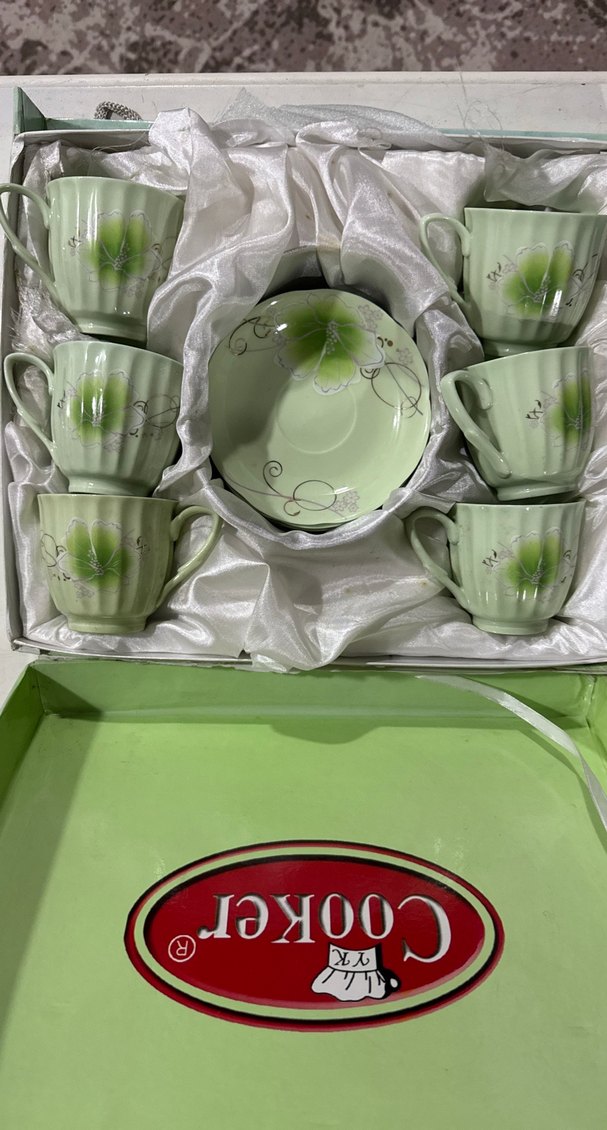 Çiçek desenli, açık yeşil renkte 6 porselen fincan ve bir tabağı içeren, Cooker marka kutuda sunulan fincan takımı. ☕