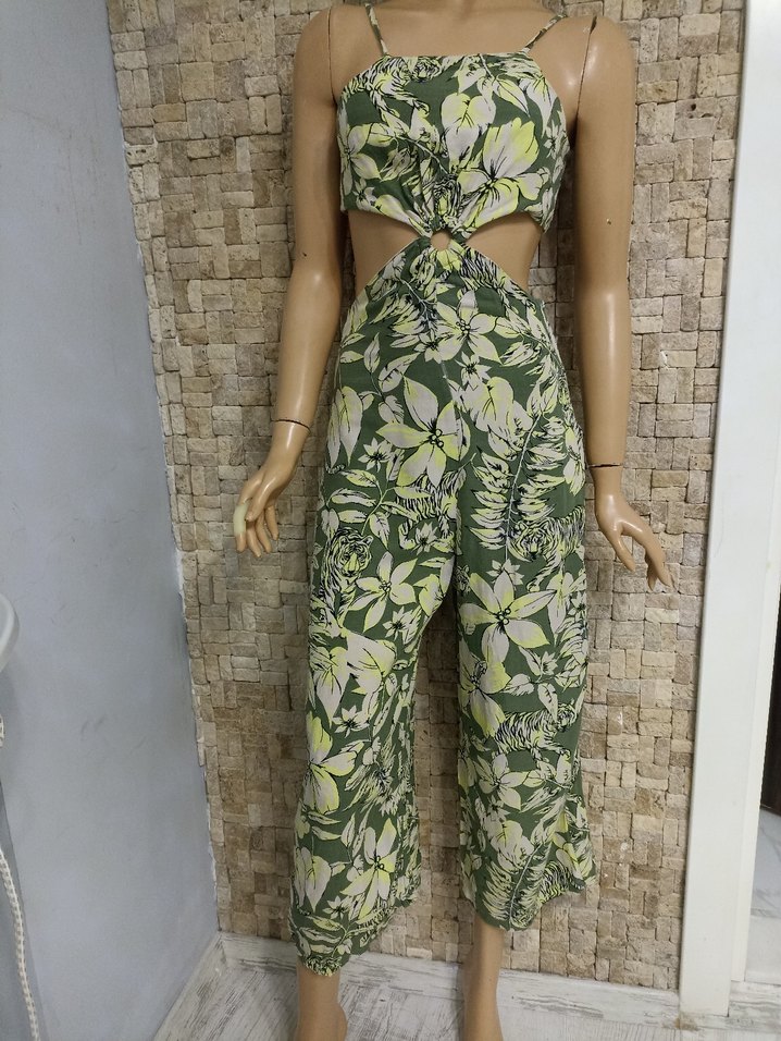 Uzun, regular fit tulum, askılı kollar ve yeşil çiçek desenli tie-dye ile bohem tarzda, drapeli tasarıma sahiptir. Açık hava için uygundur. Beden 26 uzunluk 140cm %100viscosa
