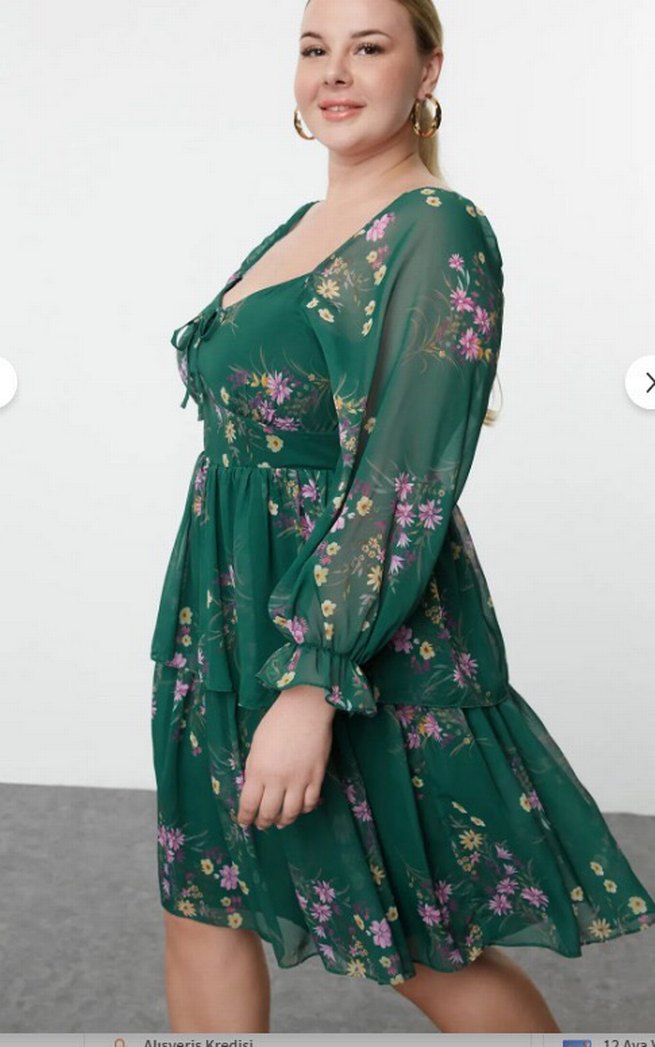 Koyu yeşil, çiçek desenli midi elbise; V yakalı, bol kesim, fırfır detaylı ve askılı kollu, romantik akşamlar için uygun .