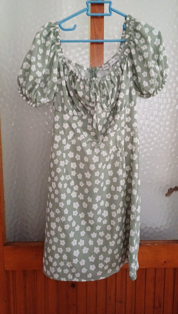 Yeşil renkte, çiçek desenli midi elbise. Bol kesim, kısa balon kollu ve kayık yaka. Fırfır detaylı, bohem tarzda rahat bir model.