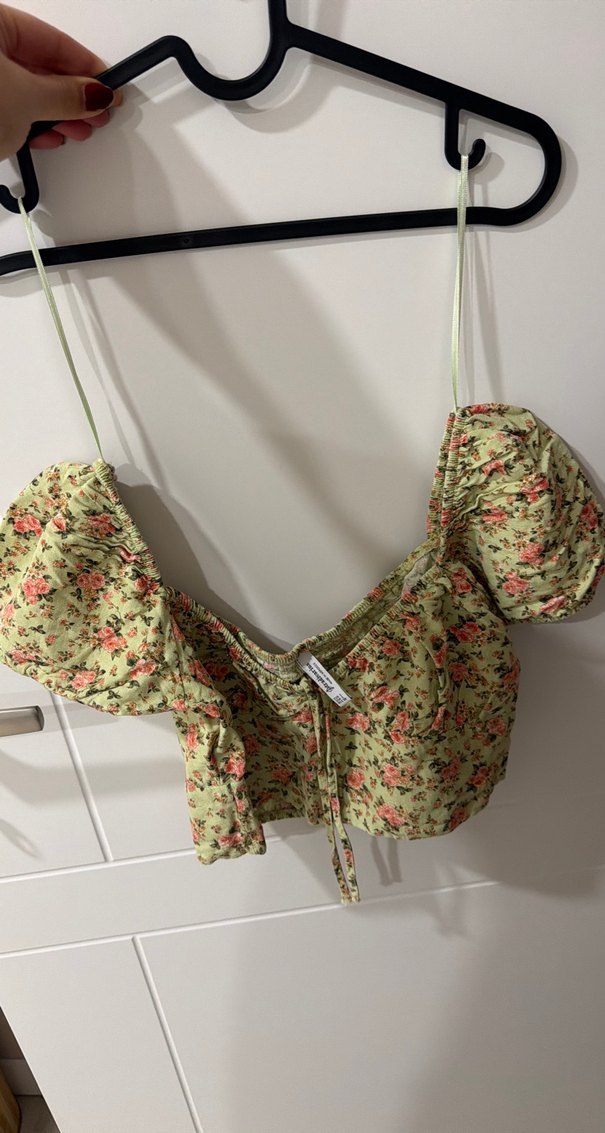 Yeşil pastel çiçek desenli, askılı ve straplez kısa büstiyer, fırfır detaylı, bohem tarzda rahat bir modeldir.