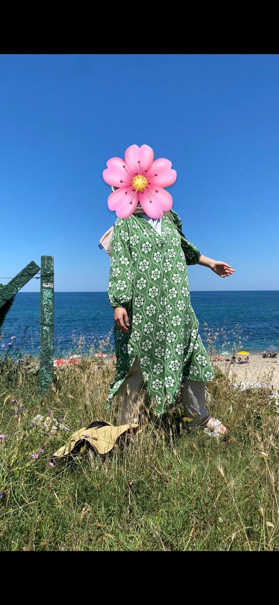 Yeşil çiçek desenli, bol kesim, uzun kollu ve yüksek yakalı uzun elbise. Sentetik kumaştan, drapeli bohem tarzda, günlük kullanım için uygun.