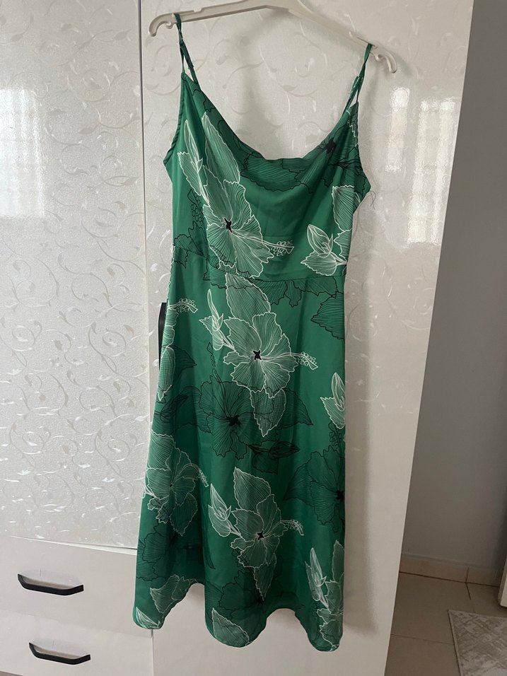 Yeşil, çiçek desenli, drapeli yakaya sahip, uzun ve sıfır kollu, bohem tarzda fitted elbise .
