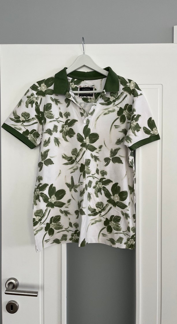 Erkekler için bol kesim, kısa kollu, yakalı polo tişört. Beyaz zemin üzerinde açık yeşil çiçek desenli, düğmeli. Yumuşak sentetik kumaştan, rahat sokak stili için uygun.