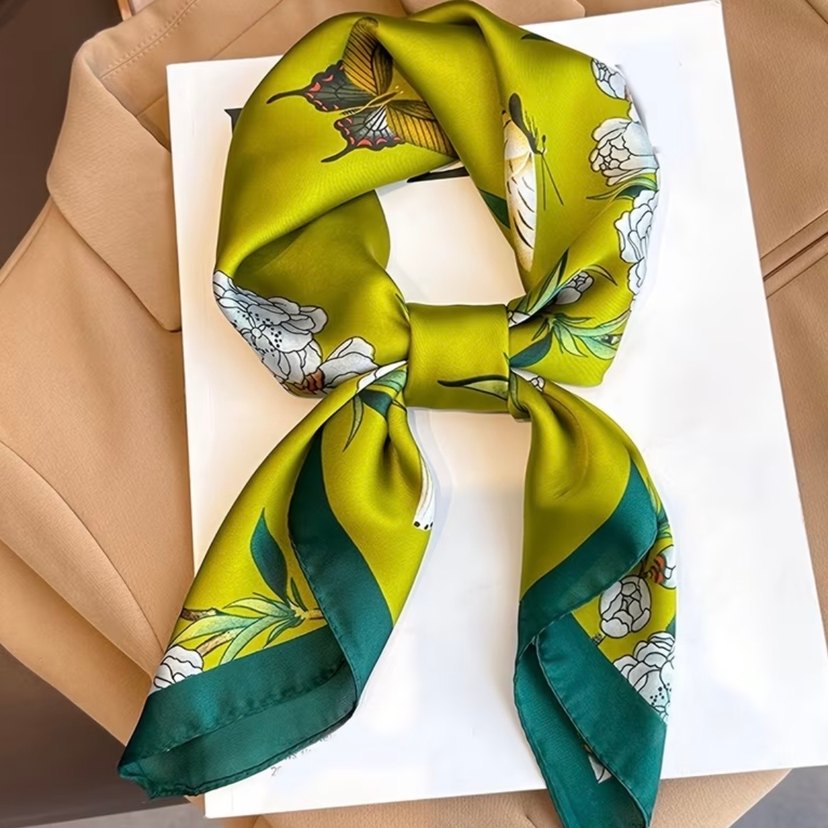 Yeşil çiçek desenli ipeksi Fular