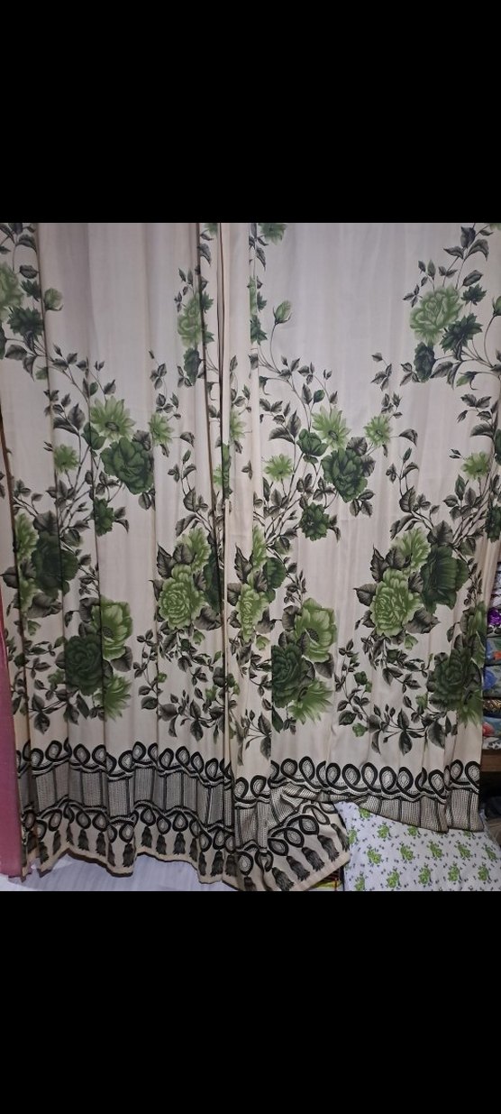 Alt kısmında dekoratif bordür bulunan, hafif yeşil çiçek desenli konvansiyonel tarzda perde.