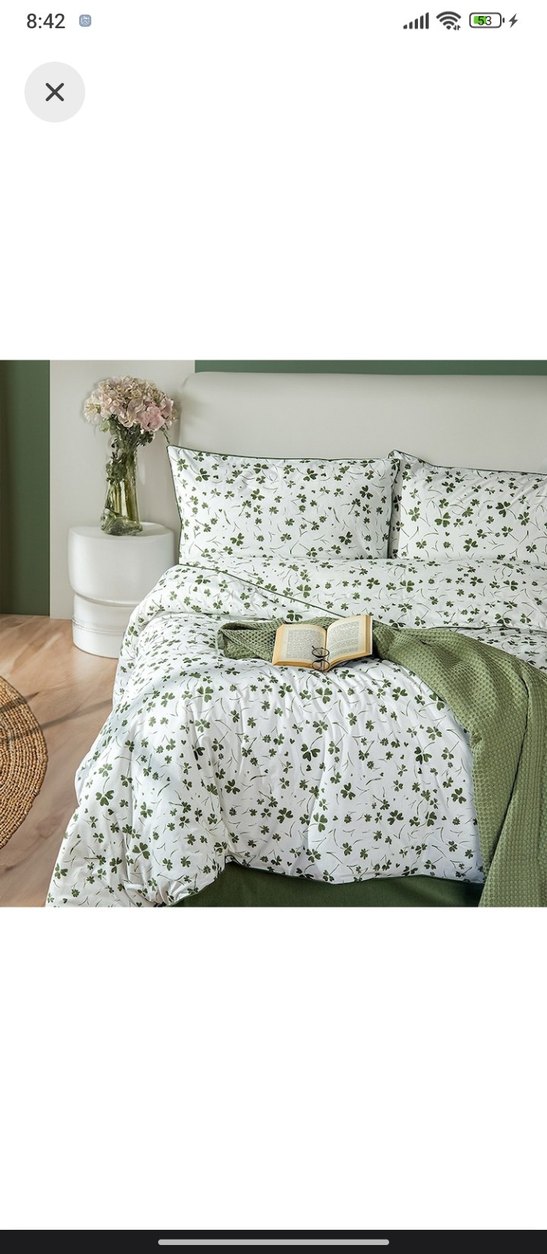 biyeli çift kişilik nevresim takımı Hafif yeşil çiçek desenli nevresim ve çarşaf takımı, yumuşak ve konforlu kumaştan üretilmiştir. Doğal ve ferah bir yatak odası için ideal.