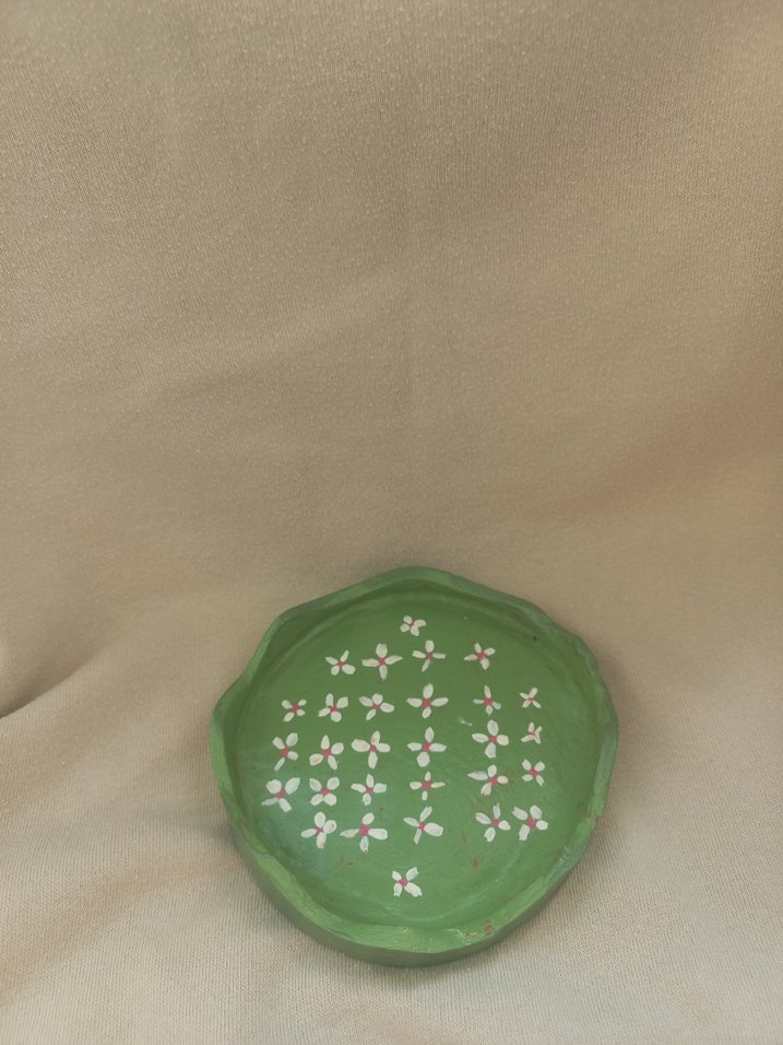 Çiçek desenli küçük beyaz ve pembe detaylarla yeşil seramik,takılık, gümüşlük. İstenilen renkte yapılır.