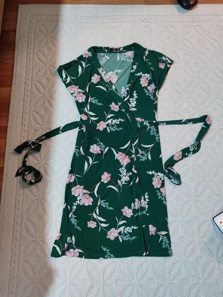 Çiçek desenli, V yakalı ve askılı kollarıyla yeşil uzun, vücuda oturan elbise. Belde kemer bulunan, yumuşak sentetik kumaştan boy 98 cm