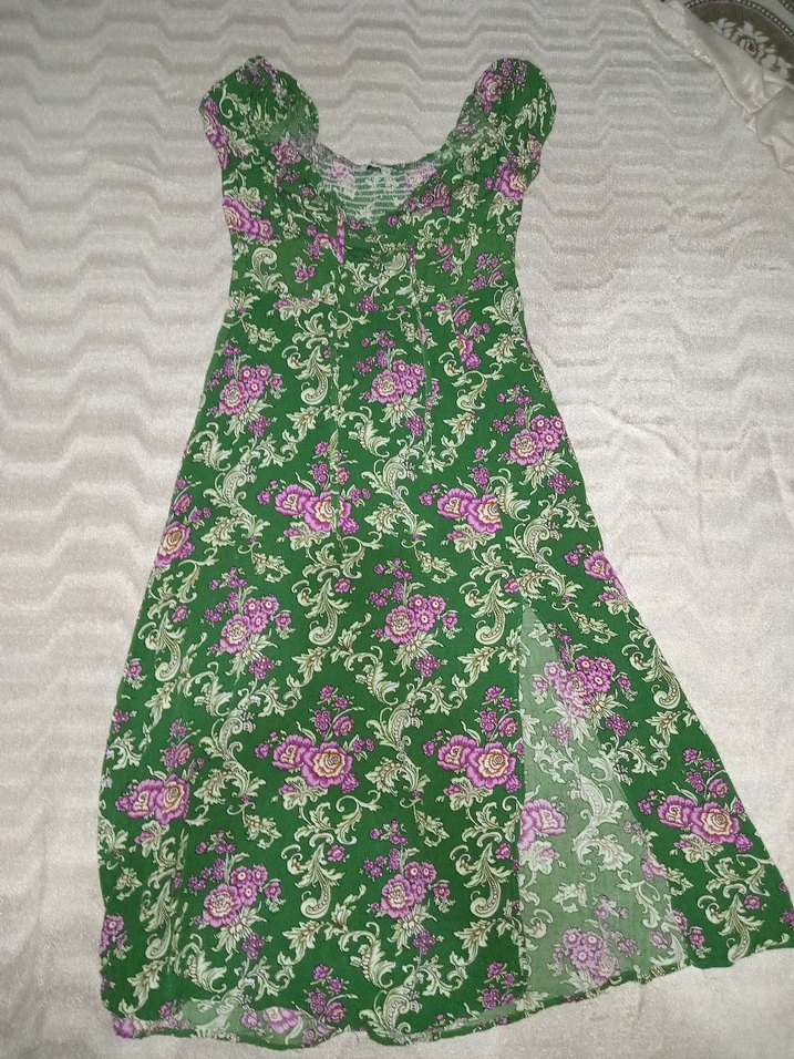 Yeşil çiçek desenli, dantel detaylı, bohem tarzda, yumuşak sentetik kumaştan yapılmış, günlük kullanım için uygun, vücuda oturan uzun elbise.