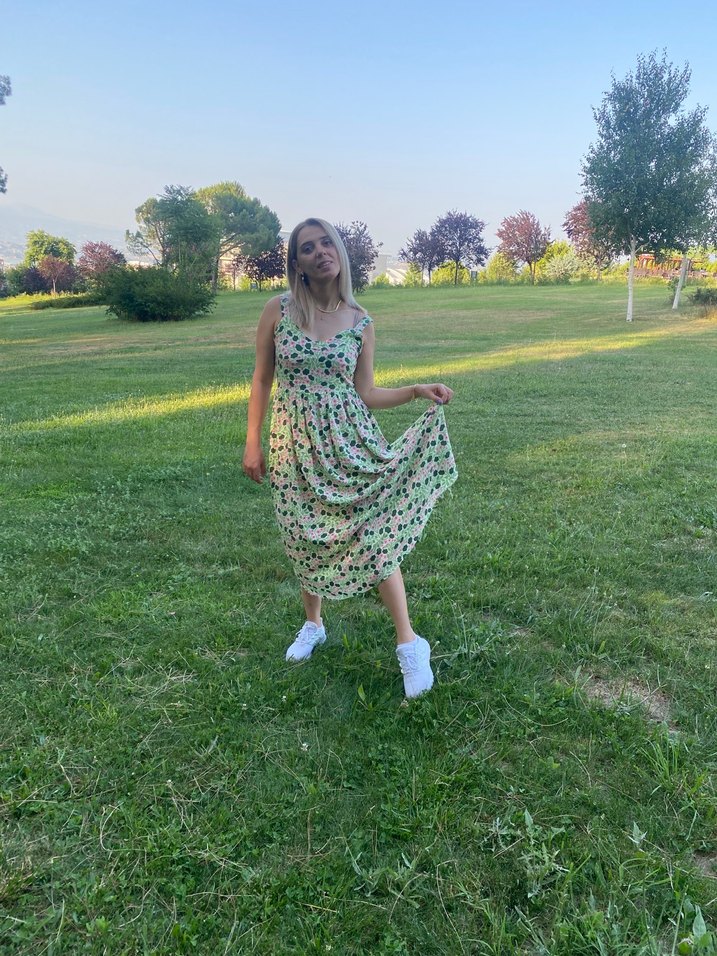 çiçek desenli, uzun ve kolsuz bu yeşil elbise, bol kesimiyle rahat bir bohem tarz sunar. Sayılı giyilmiştir bir sorunu yoktur