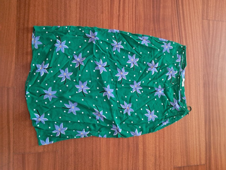 Yeşil renkte, parlak çiçek desenli, dökümlü ve bol kesim uzun etek. Sentetik kumaştan yapılmıştır, bohem tarzını yansıtır ve günlük kullanıma uygundur.