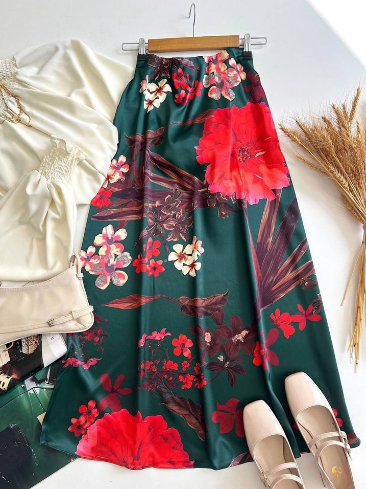 Yeşil renkte, bol kesim ve drapeli uzun etek, canlı çiçek desenlerine sahip. Yumuşak sentetik kumaştan, bohem tarz için uygun, günlük kullanıma ideal.