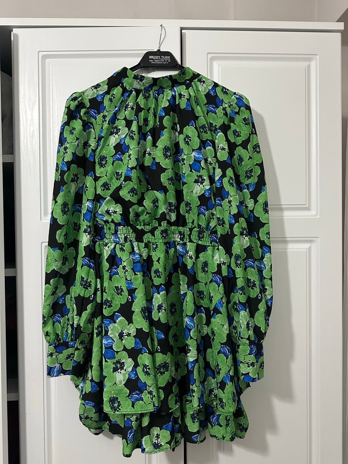 Uzun kollu, yüksek yakalı, bol kesim yeşil mini elbise, çiçek desenli ve fırfırlı detaylara sahip. Sentetik kumaştan, sokak stili için uygun.Az kullanılmış l xl bedene uygun gögüslerim 90b olmasına rağmen rahat oluyor