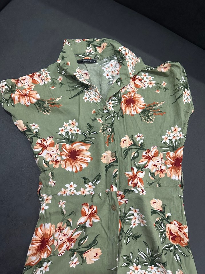 Kadın gömlek elbise, kısa kollu, V yakalı ve düğmeli. Uzun kesim, pastel yeşil çiçek desenli, bol kesim bohem tarzda.