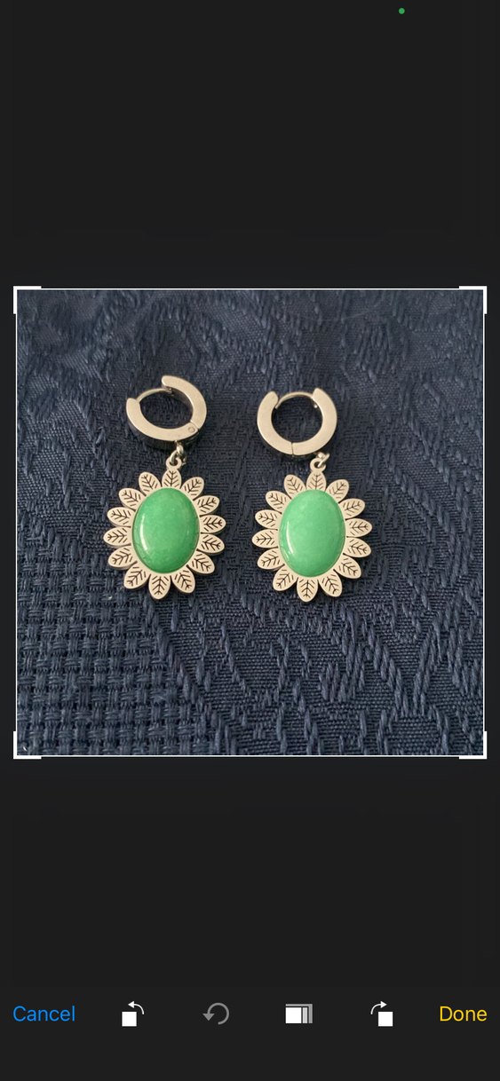 Parlak yeşil oval taşlar ve çiçek desenli dantel detaylı, kısa uzunlukta bohem tarzda küpeler. Çeliktir.