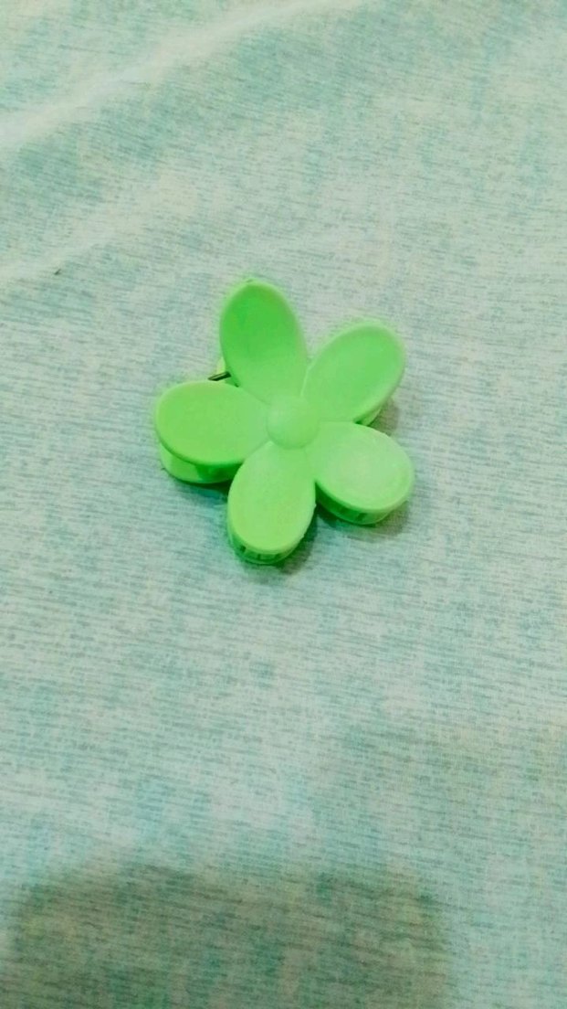 yeşil plastikten yapılmış çiçek şeklinde sade ve minimalist maşalı saç tokası.