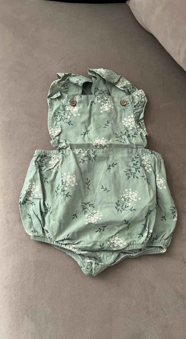 Omuzlarında fırfır detaylı, çiçek desenli pastel yeşil bebek kız tulumu, rahat ve şık.