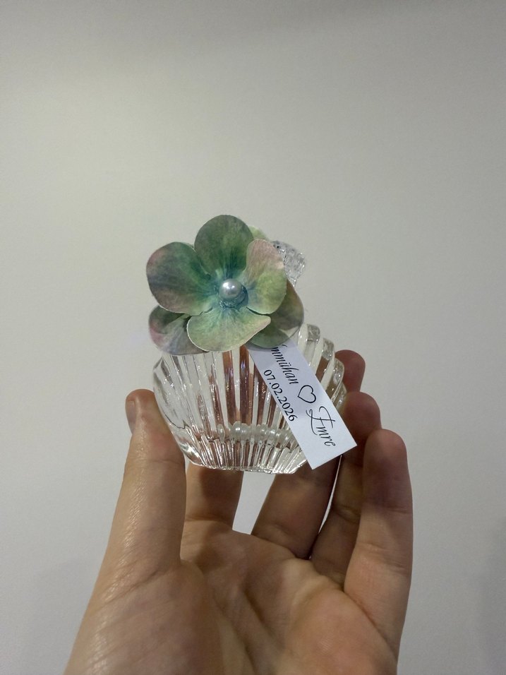 Camdan yapılmış küçük bir hediye kutusu, üzerinde isteğe bağlı şekilde renkli çiçek süsü ve özel günler için etiket bulunur.