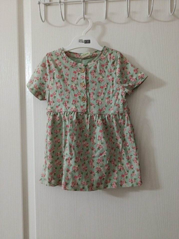 Pamuklu, kısa kollu, düğmeli ve bol kesim yeşil pastel tonlarında çiçek desenli kız çocuk elbisesi, bohem tarzda. yurt dışından hediye geldi mevsimi tutmadı giydiremedik,kalıbı geniş önce elbise ilerleyen zamanda tişört gibi bluz gibi giymeye uygun