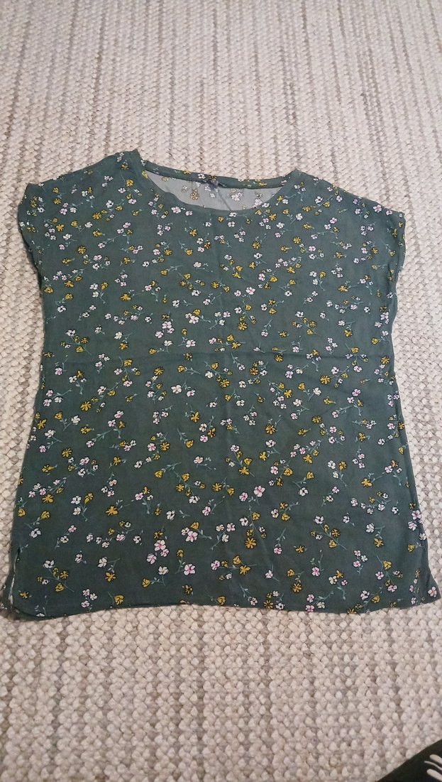 Yeşil renkli, kısa kollu, yuvarlak yakalı, yanlardan minik yırtmaçlı, çiçek desenli tarzda kadın bluz.