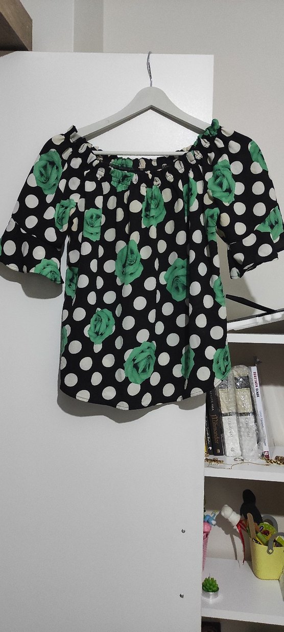 Kısa kollu, salaş kesim, yeşil çiçek ve puantiyeli desenli bluz. İster omzu düşük ister düşürmeden kullanıma uygundur. M/L uyumludur. Esnektir.