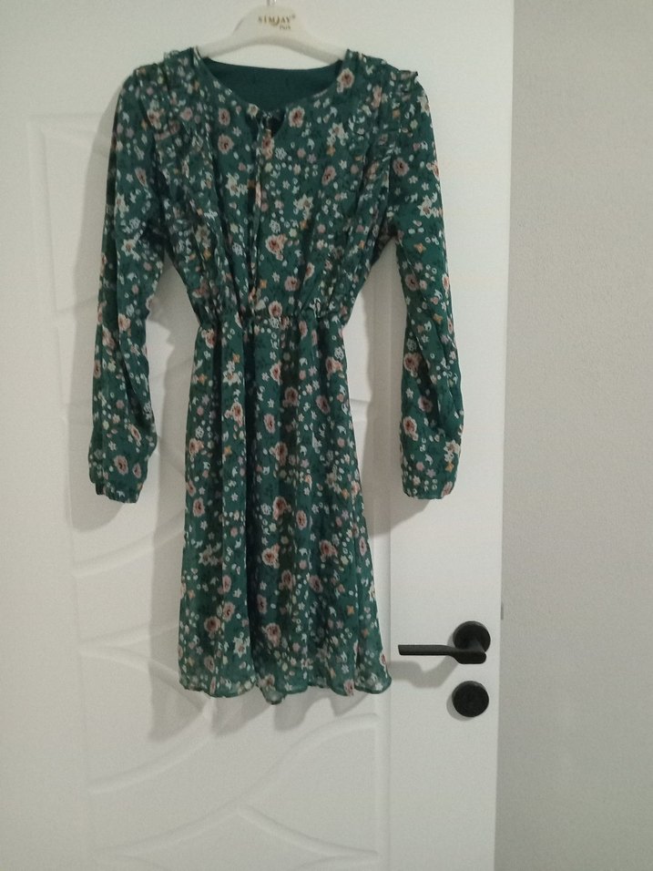 Koyu yeşil midi boy elbise, uzun kollu, yuvarlak yaka, bol kesim, çiçek desenli ve fırfırlı detaylara sahip, bohem tarz için uygun .