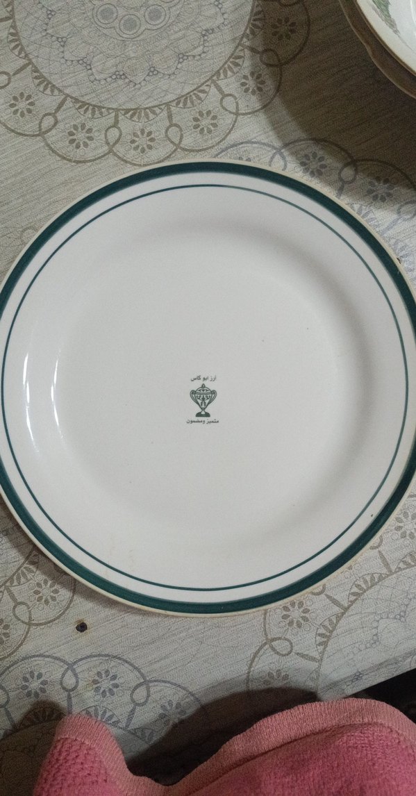 Beyaz tabakta kenarında açık yeşil çift çizgi bulunur, sade ve klasik bir tasarıma sahiptir. ️ Arabistan'dan alındı. 3lü servis tabağı