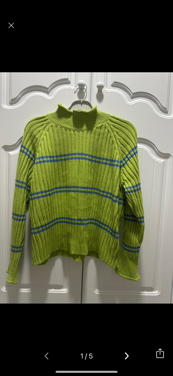 Mavi çizgili, boğazlı ve uzun kollu, yeşil renkli, bol kesim triko kazak. Rahat ve gündelik tarz için uygundur.