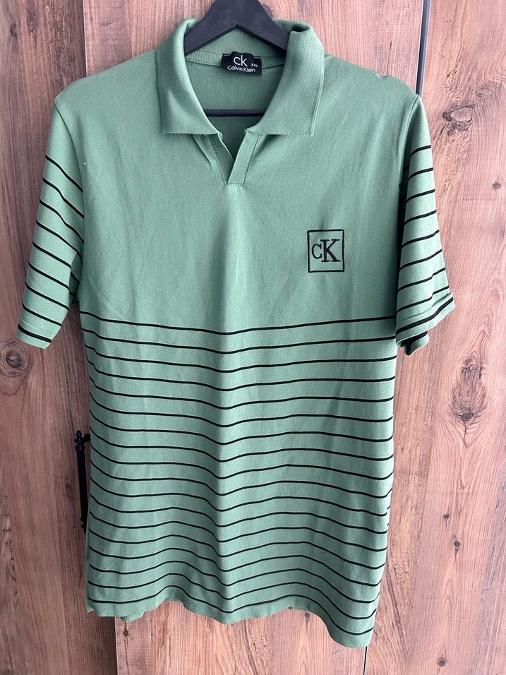 Bu erkek polo tişört, yakalı ve kısa kolludur. Pastel yeşil renkte, siyah yatay çizgiler ve göğüste CK logosu bulunur. Yumuşak sentetik örme kumaştan üretilmiştir, günlük rahat stil için uygundur.