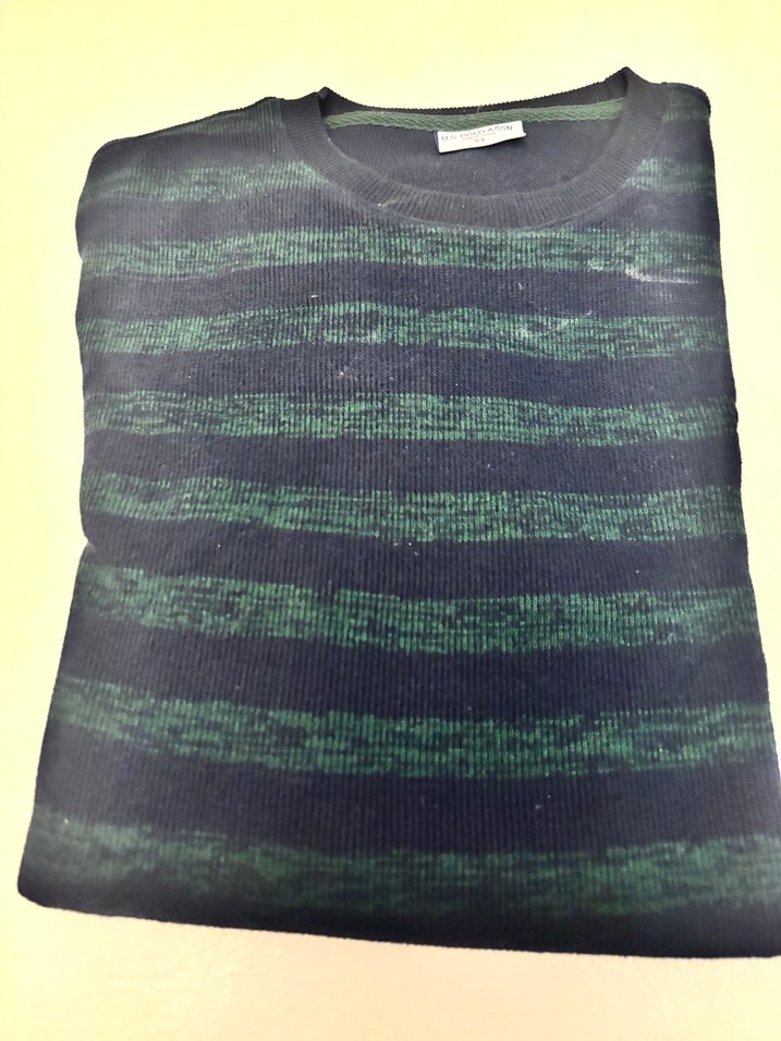Yuvarlak yaka, uzun kollu ve ince dokuma yeşil çizgili erkek kazak, günlük rahat kullanım için uygundur.